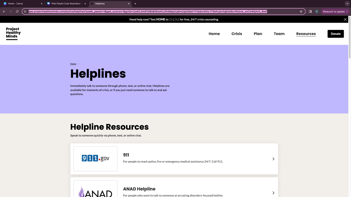 The Project Healthy Minds site includes direct links to various helplines.